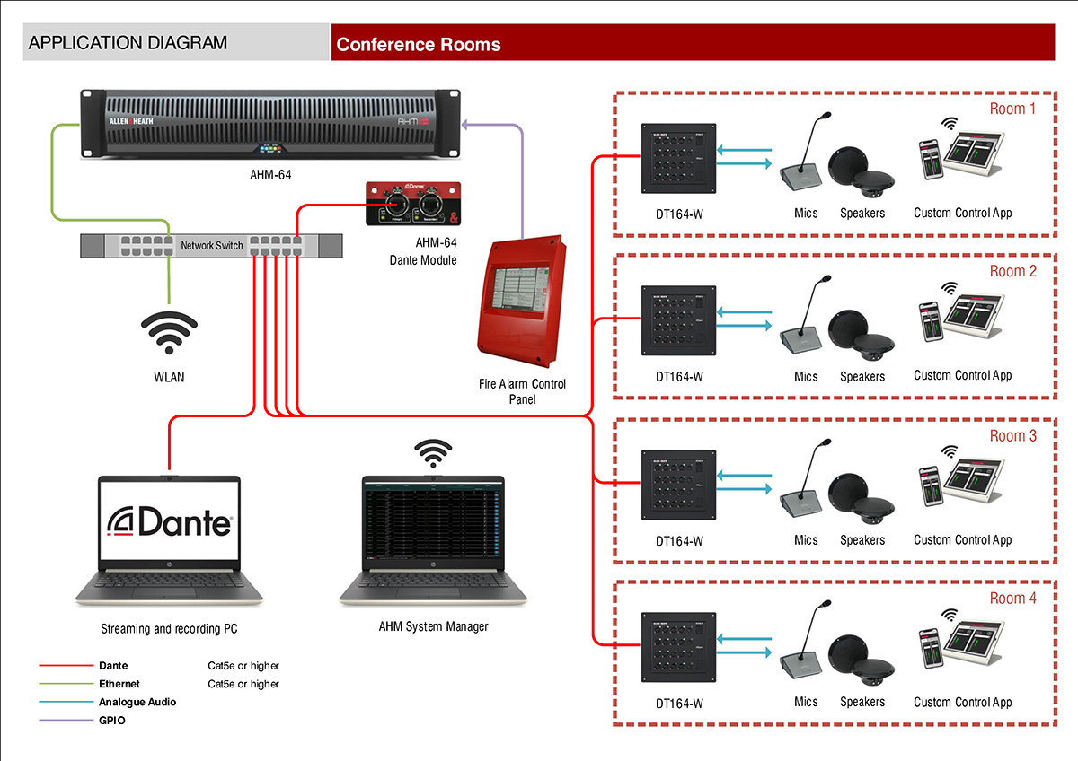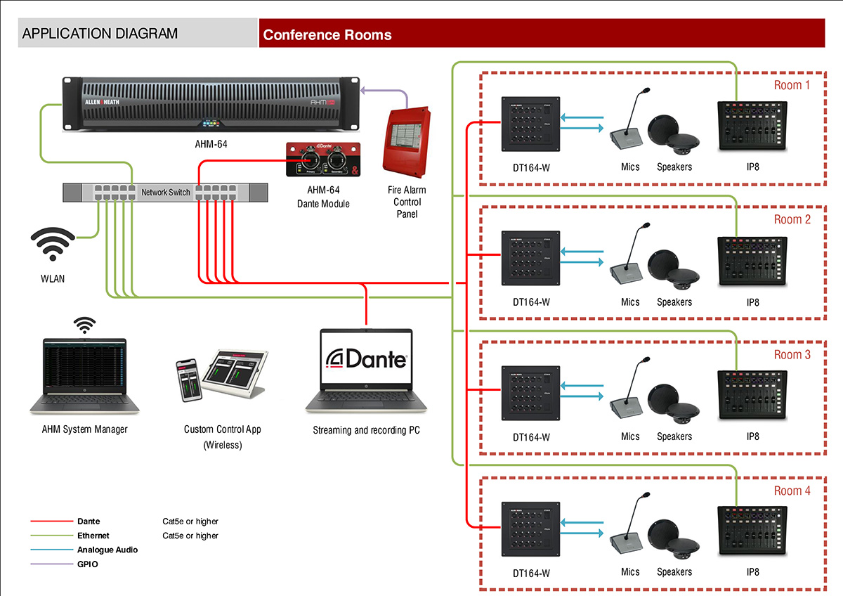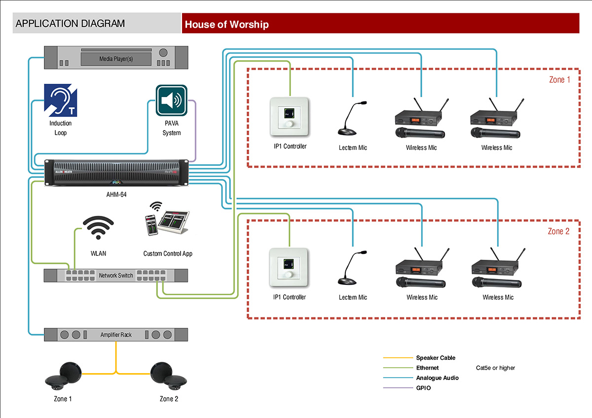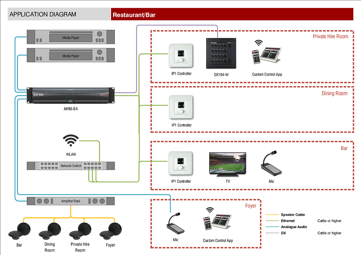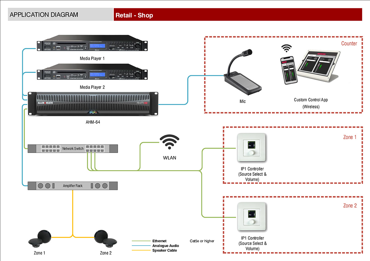 AHM-64システムは、ALLEN&HEATHの各種リモートコントローラー、GPIO、およびサードパーティ製デバイスを使用してコントロールが可能です。標準TCP/IPネットワークを介した最大96台のIPリモートコントローラーを使用し、各部屋でローカルボリュームコントロール、ソース選択、プリセットリコールを実行できます。