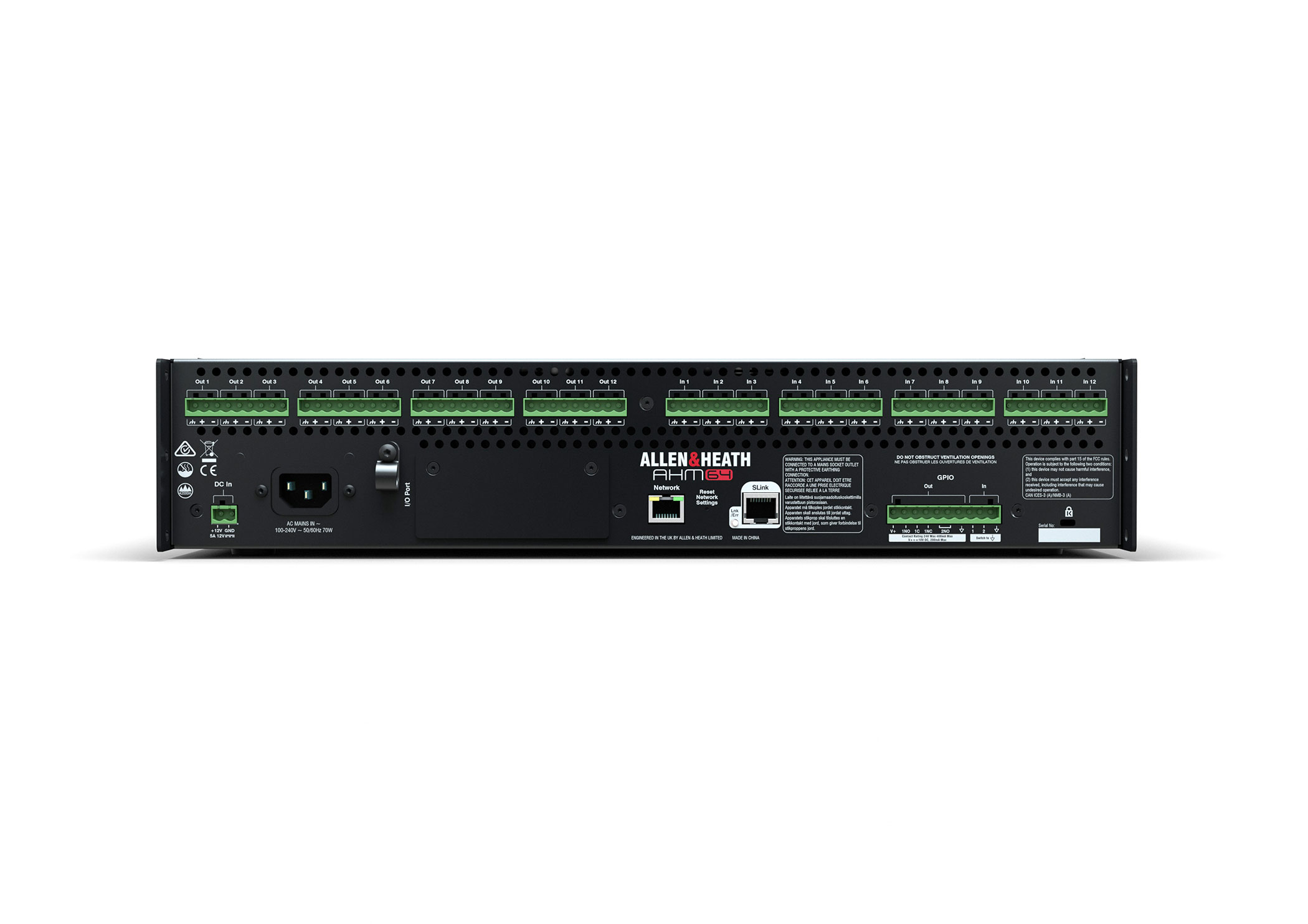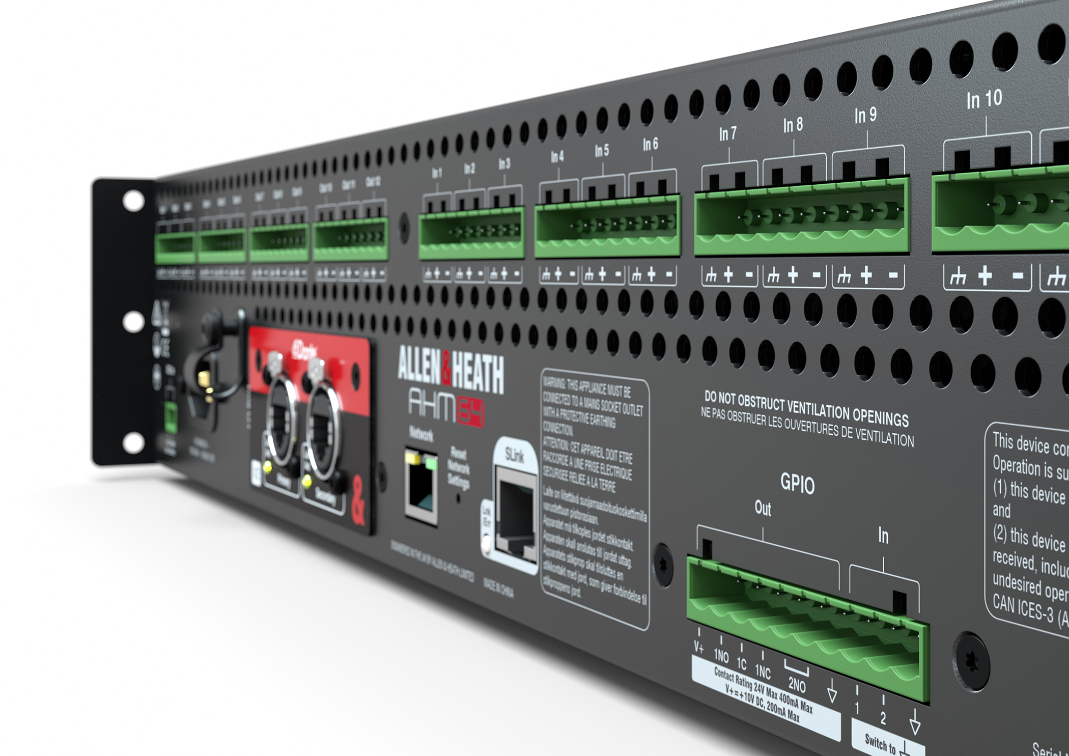AHM-64のSLinkポートは、ウォールマウントやラック、ポータブルオプションを含むAllen & Heathの幅広い種類のI/Oシリーズから最大8つのリモートエクスパンダーへのプラグアンドプレイを可能にします。最大268のルーティング可能なシステム入出力により、シングルルームから大規模な分散スペースにわたる様々なプロジェクトに対応します。