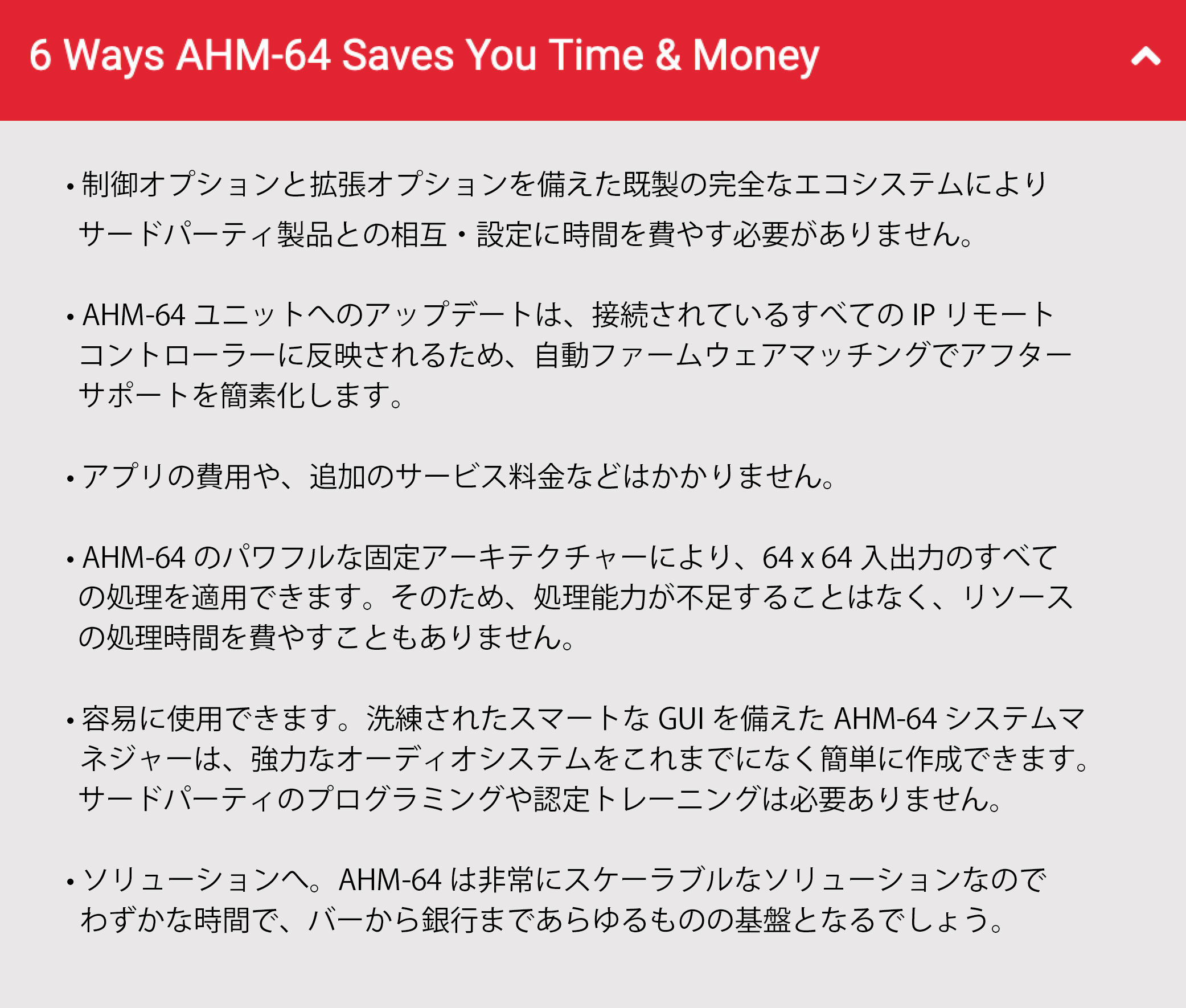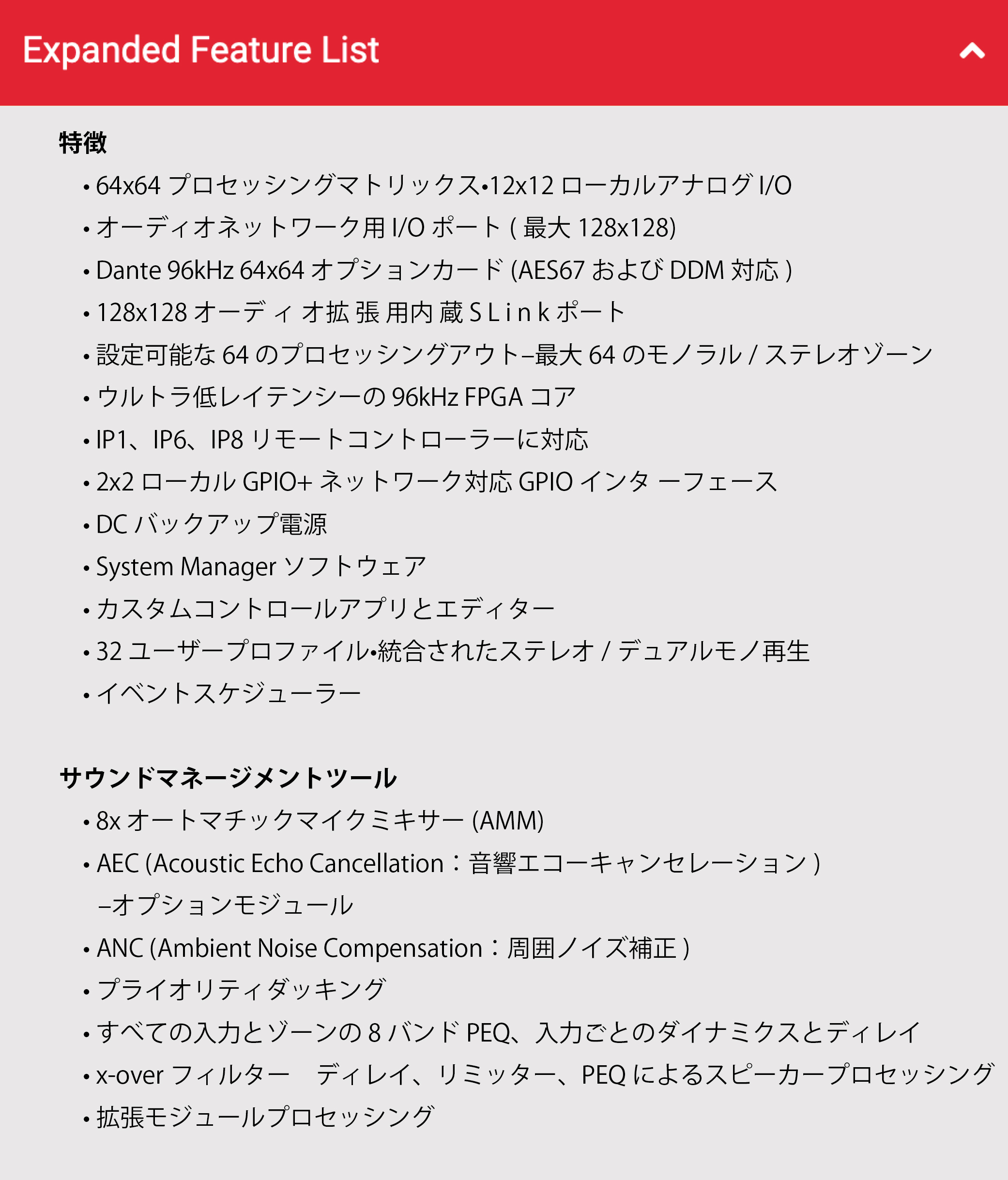 AHM-64は、拡張可能なI/O、コントロール、ダンテソリューションの包括的なエコシステムによってサポートされているパワフルな64×64オーディオマトリックスプロセッサーです。