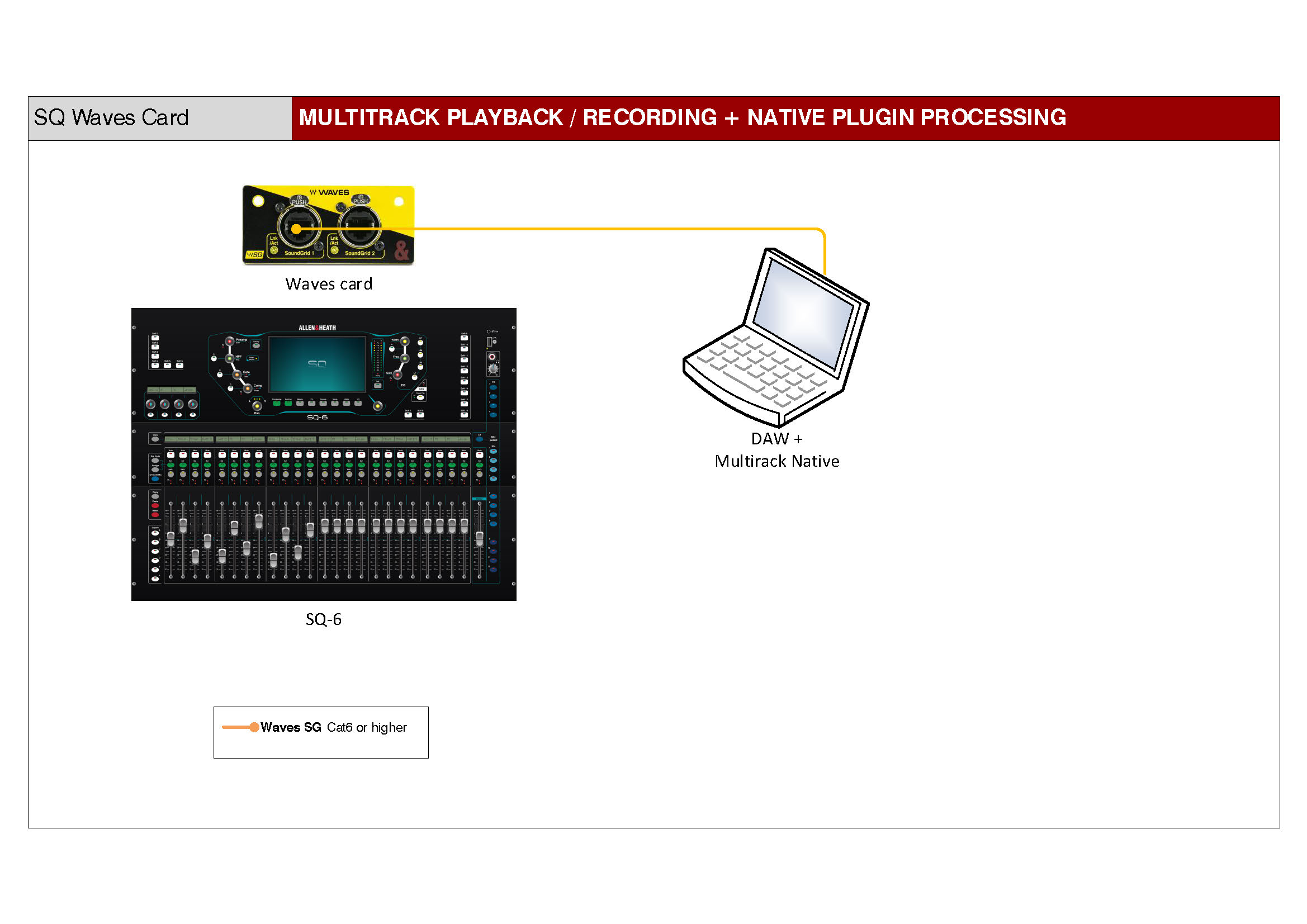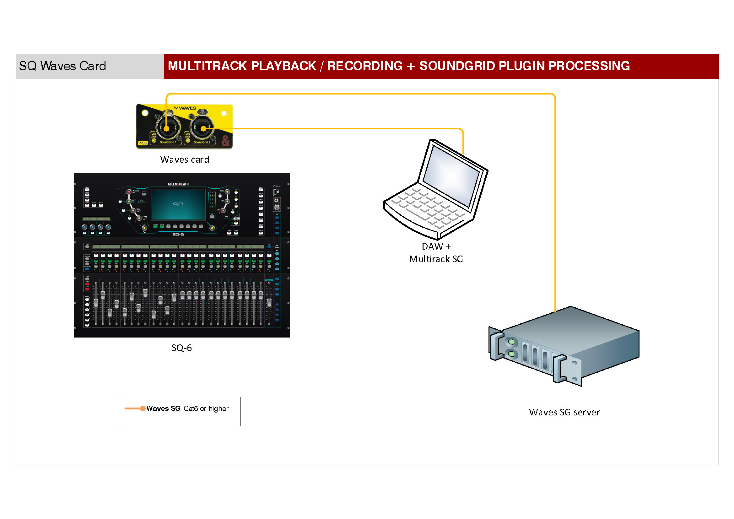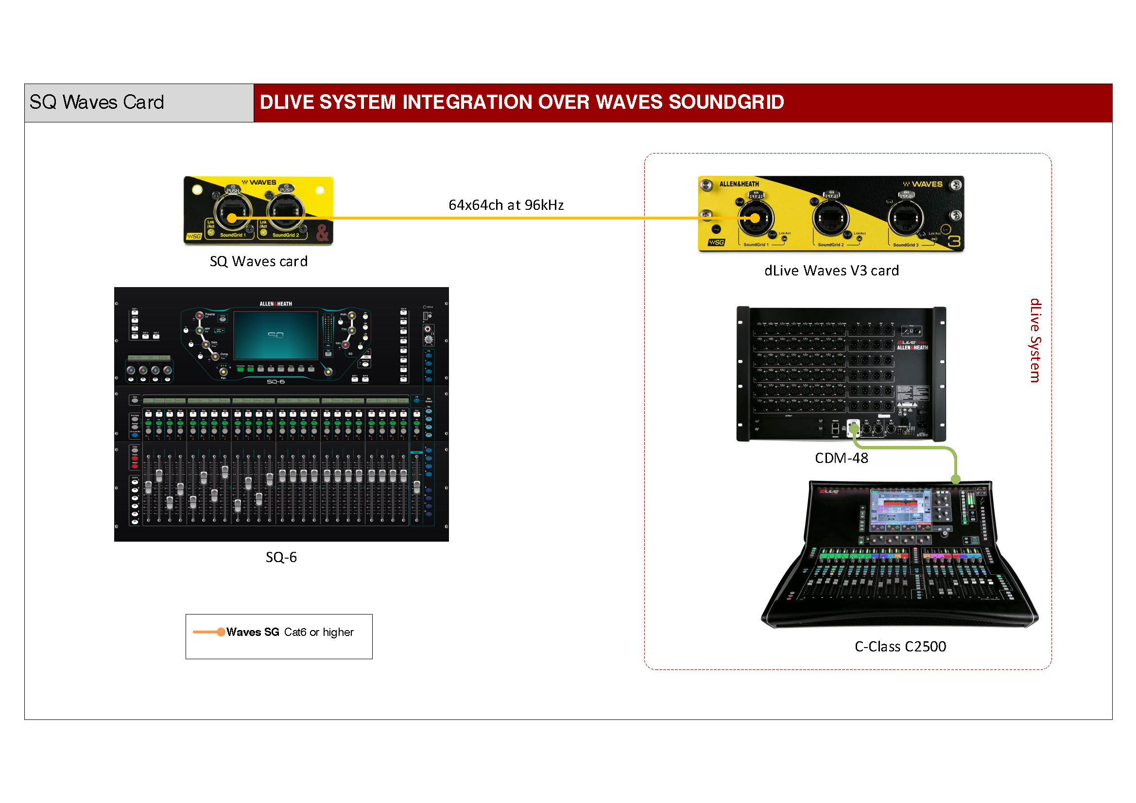 SQ Wavesカードは、I / Oポートを使用してWaves SoundGridネットワークに64×64 96kHzまたは48kHzインターフェイスを持つSQミキサーを提供します。エンジニアはWavesプラグイン処理、マルチトラック録音(96kHzまたは48kHz)、バーチャルサウンドチェック、およびオーディオ配信アプリケーション用に、Wavesカードを任意のSQミキサーに搭載することができます。