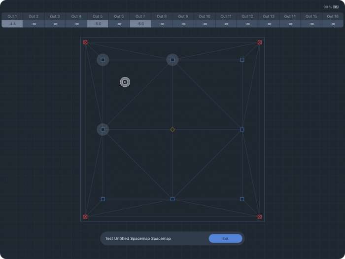 左上コーナーのSpacemapネームの横にあるTESTボタンをタップして、Spacemap Testビューを開きます。