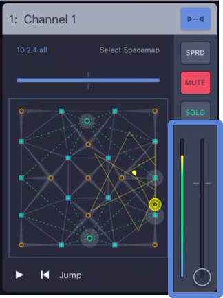 - Mixビューで、オーディオの入力があるInputチャンネルの場合、スピーカーが接続されているスピーカーノードがレベルを示すようにSpacemapパンナーを動かしてみる。
