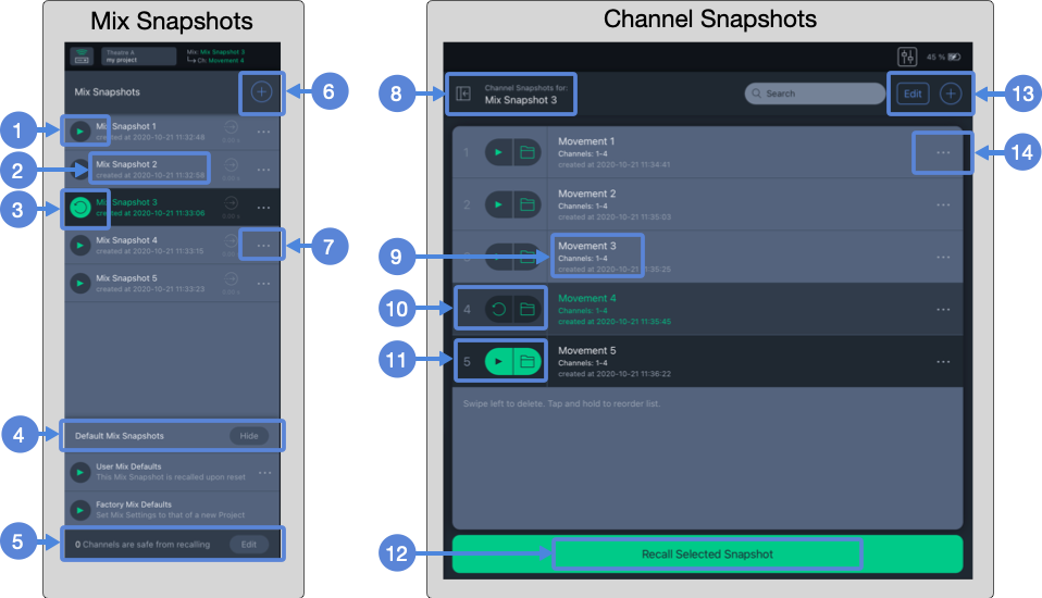 - 11選択したChannel Snapshotです。PLAY ボタンまたは Recall Selected Snapshot ボタン12をタップしてリコールします。
